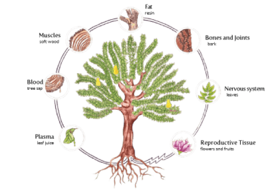 En médecine ayurvédique, les plantes sont divisées en sept catégories selon les types de tissus sur lesquels elles agissent. Ainsi, chaque partie d'une plante peut être associée à un tissu correspondant du corps humain (dhātus). Le jus des feuilles correspond au plasma sanguin (rasa), la sève représente le sang (rakta), le bois tendre correspond aux muscles (mamsa), la résine est le tissu adipeux (meda), l'écorce agit sur les os et les articulations (asthi), les feuilles sont liées au tissu nerveux (majja) et enfin, les fleurs ou les fruits sont liés à l'activité des organes reproducteurs masculins et féminins (shukra/arthava).